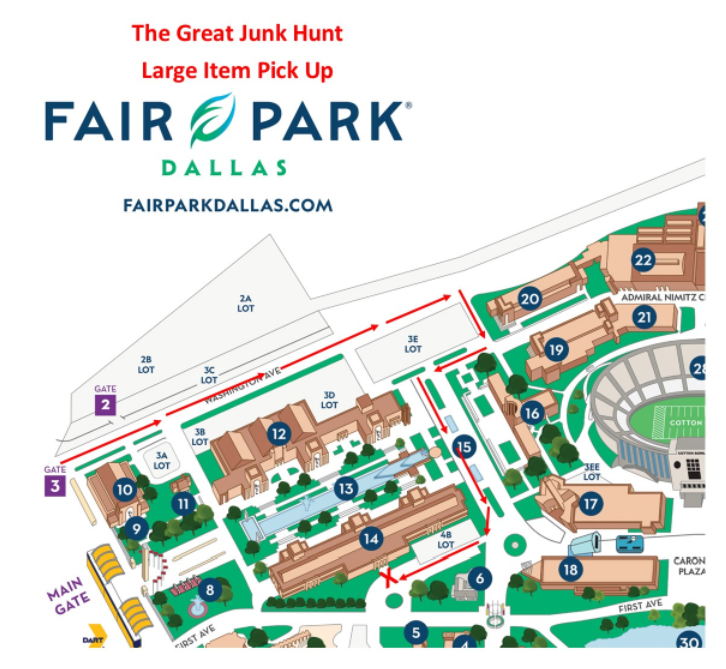 See the map below. Customers will need to show their large item pick up pass on their phone to enter at Gate 3 to pick up their large items.
